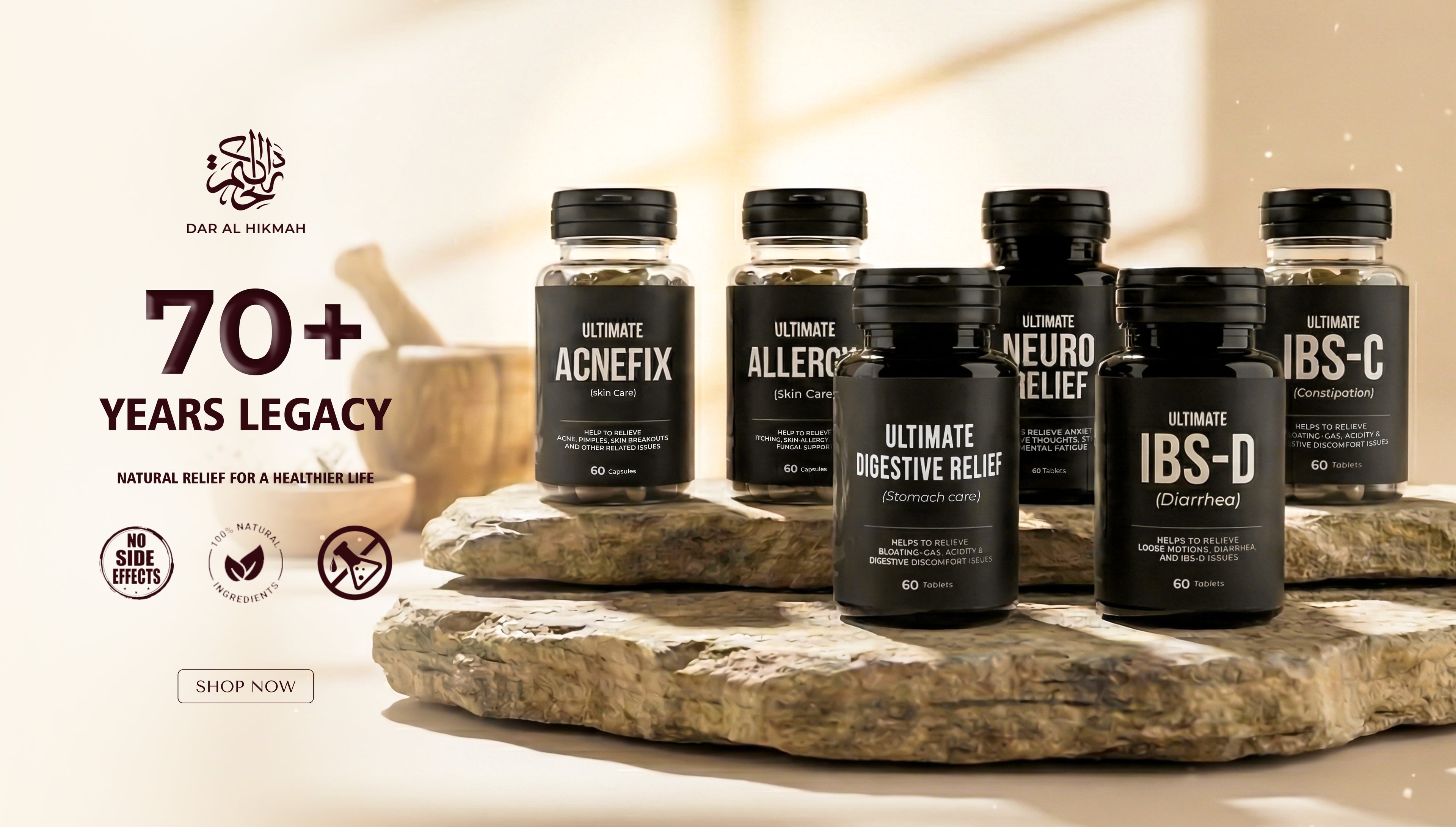 With 70 years of legacy and a secret formula, Dar al Hikmah revolutionizes herbal medicine, offering natural, effective solutions. We set the highest standards of purity and quality. Experience the harmony of nature with our symphony of herbal integrity and organic essence.